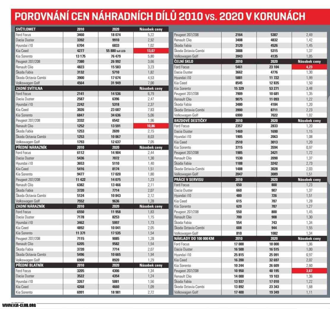 Porovnání cen náhradních dílu 2010 vs 2020